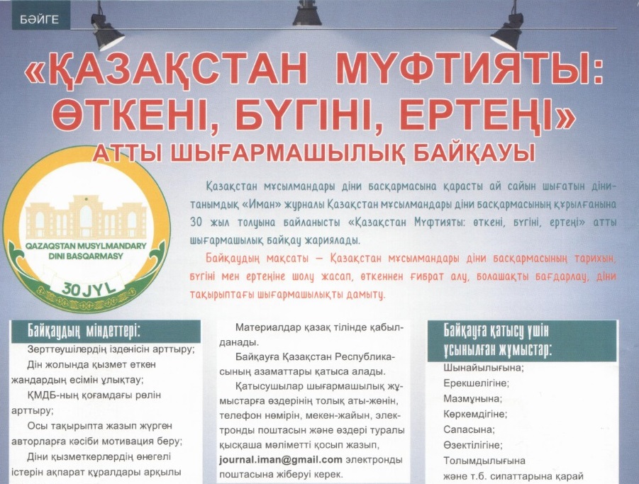 QMDB-nyń 30 jyldyǵyna oraı «Iman» jýrnaly uıymdastyrǵan «Qazaqstan múftııaty: ótkeni, búgini, erteńi» atty shyǵarmashylyq baıqaý qorytyndylandy.