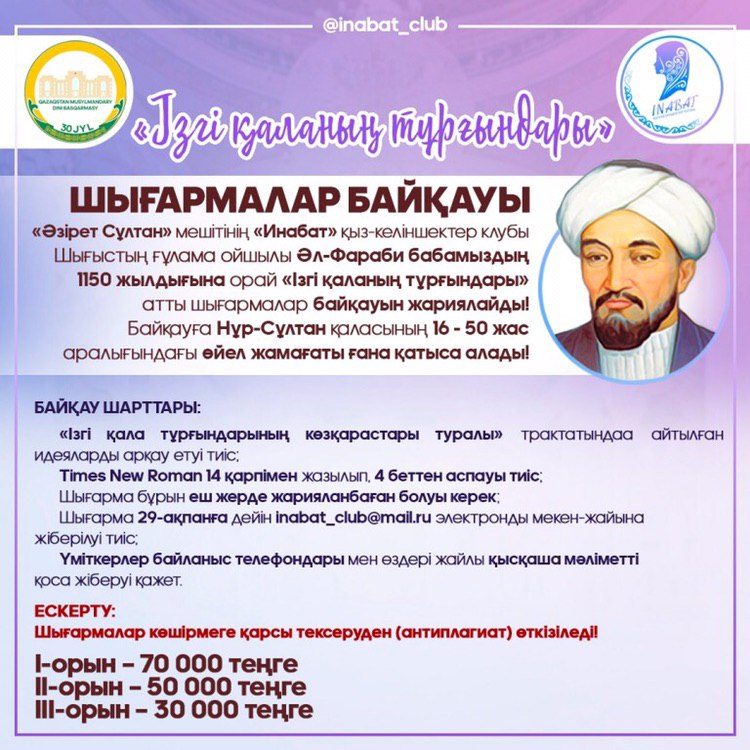 «Áziret Sultan» meshitiniń «Inabat» qyz-kelinshekter klýby Shyǵystyń ǵulama oıshyly Ál-Farabı babamyzdyń 1150 jyldyǵyna oraı «Izgi qalanyń turǵyndary» atty shyǵarmalar baıqaýyn jarııalaıdy! Baıqaýǵa Nur-Sultan qalasynyń 16 men 50 jas aralyǵyndaǵy áıel jamaǵaty ǵana qatysa alady