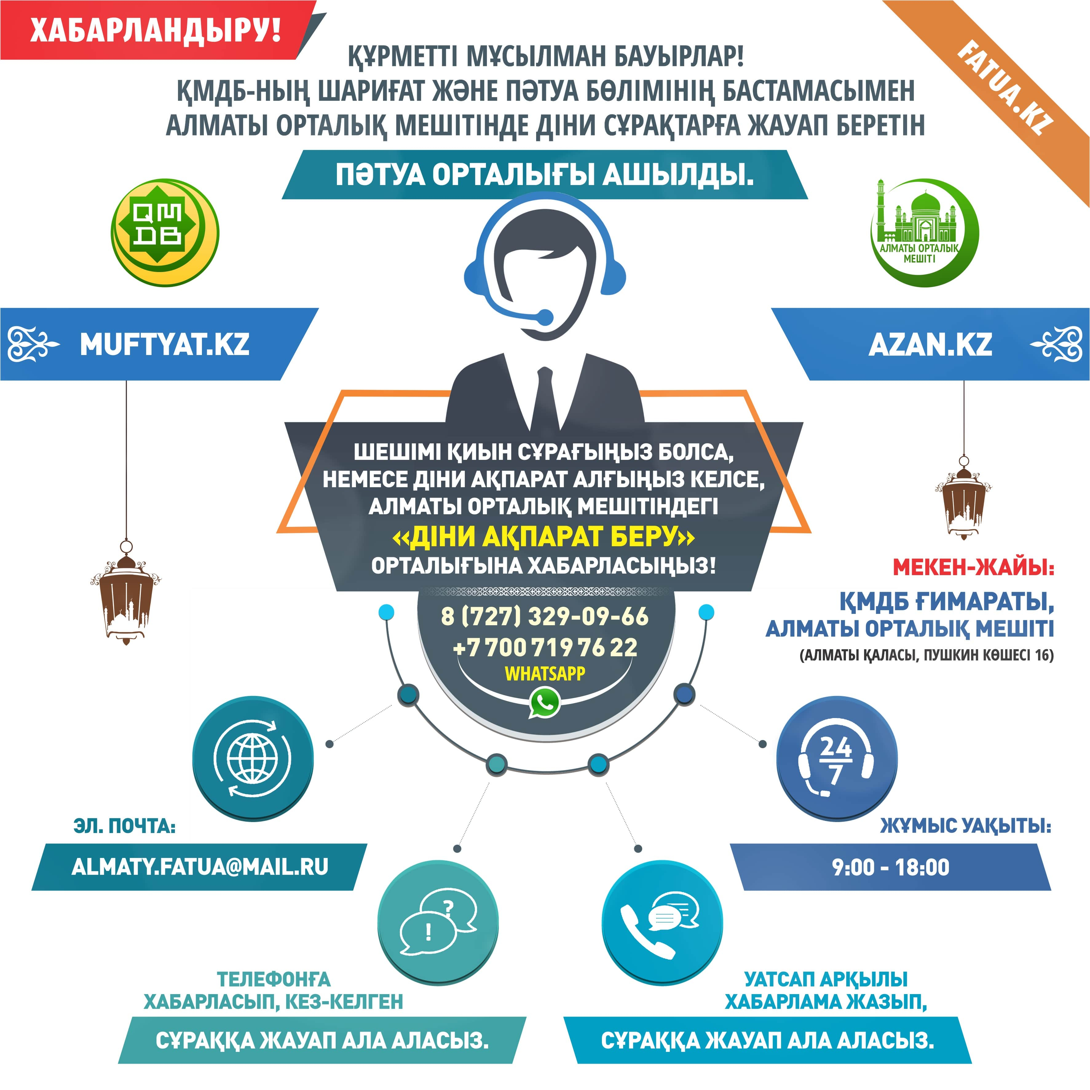 ҚМДБ-ның Шариғат және пәтуа бөлімінің бастамасымен Алматы Орталық мешітінде діни сұрақтарға жауап беретін пәтуа орталығы ашылды.