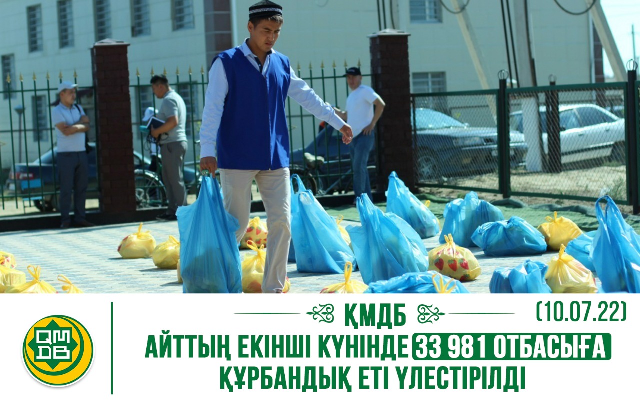Мұсылман қауымының ұлық мейрамында қайырымдылық шарасын жандандыра түсу мақсатында құрылған арнайы жұмыс тобы Құрбан айттың екінші күні республика бойынша 6578 қой, 618 ешкі, 456 ірі қара мен 11 түйе сойылса, 33 981 мұқтаж отбасыға құрбандық еті жеткізілді.