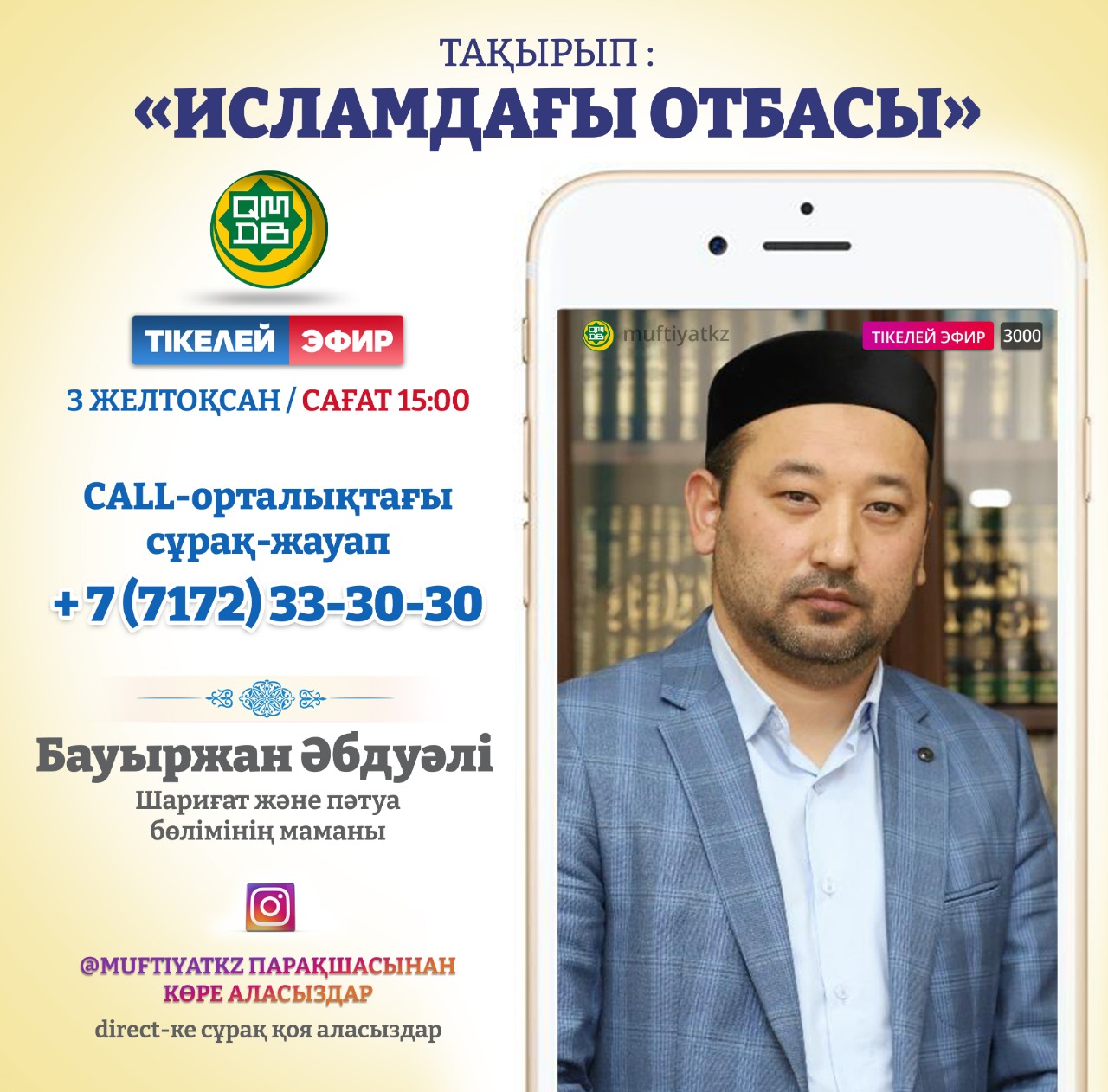 Если у вас возникнут вопросы при просмотре трансляции на @muftiyatkz вы можете позвонить в call-центр по телефону 8 7172 33 30 30. Вы также можете отправлять вопросы в дайрект.