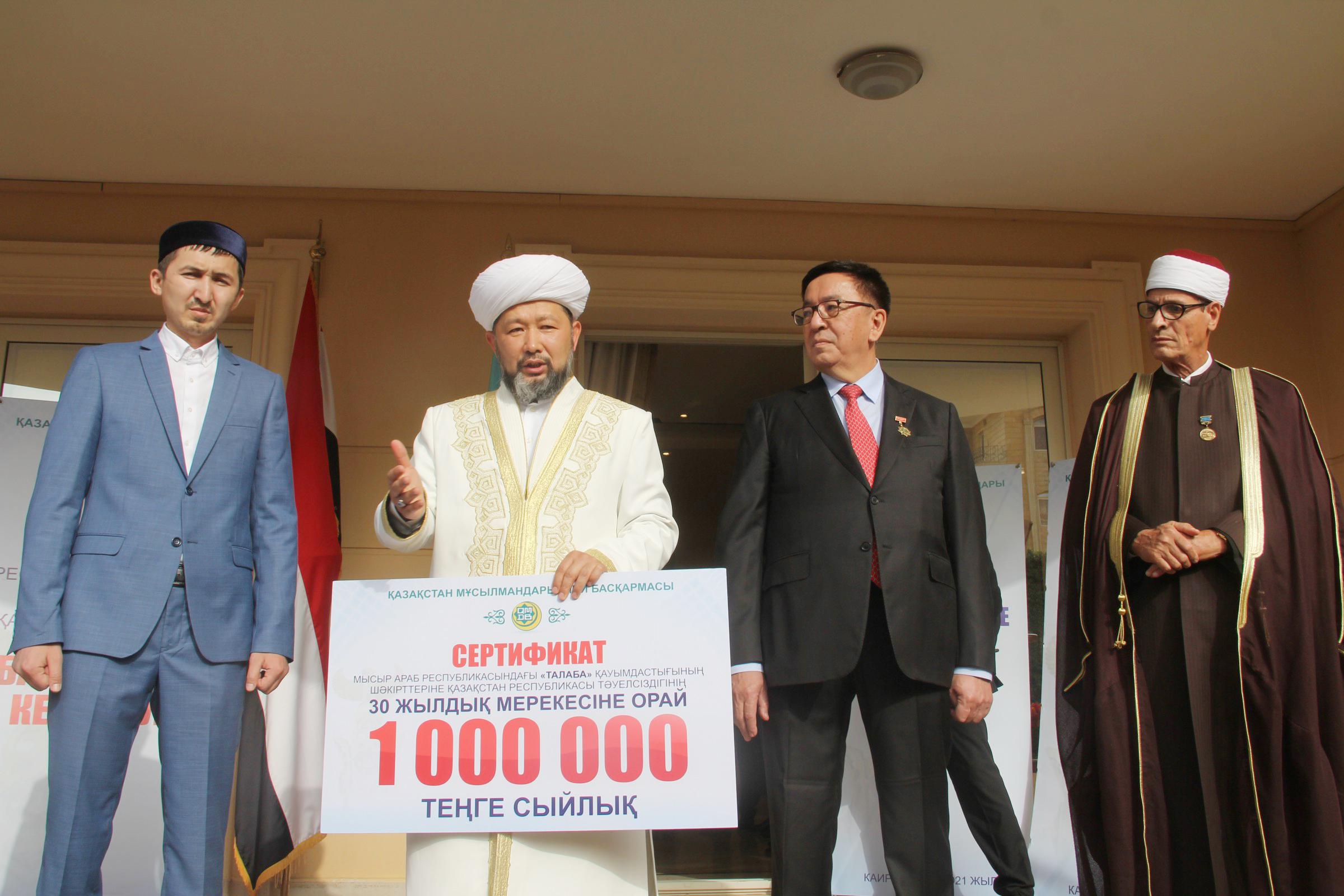 Председатель ДУМК Наурызбай кажы Таганулы во время официального визита в Арабскую Республику Египет передал 1 миллион тенге студентам Ассоциации «Талаба» по случаю 30-летия Независимости.
