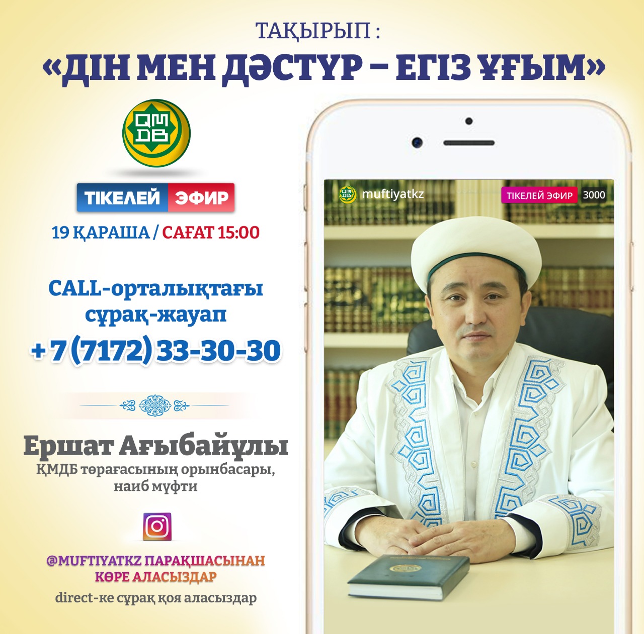 19 ноября в 15:00 на вопросы читателей в прямом эфире ответит специальный гость Религиозно-информационного центра, заместитель председателя ДУМК, наиб муфтий, исламский ученый Ершат Агыбайулы. Если у вас есть вопросы по данной теме, вы можете задать их во время просмотра трансляции на странице @muftiyatkz или позвонить в call-центр по телефону 8 7172 33 30 30. Вы также можете отправить вопросы в директ.