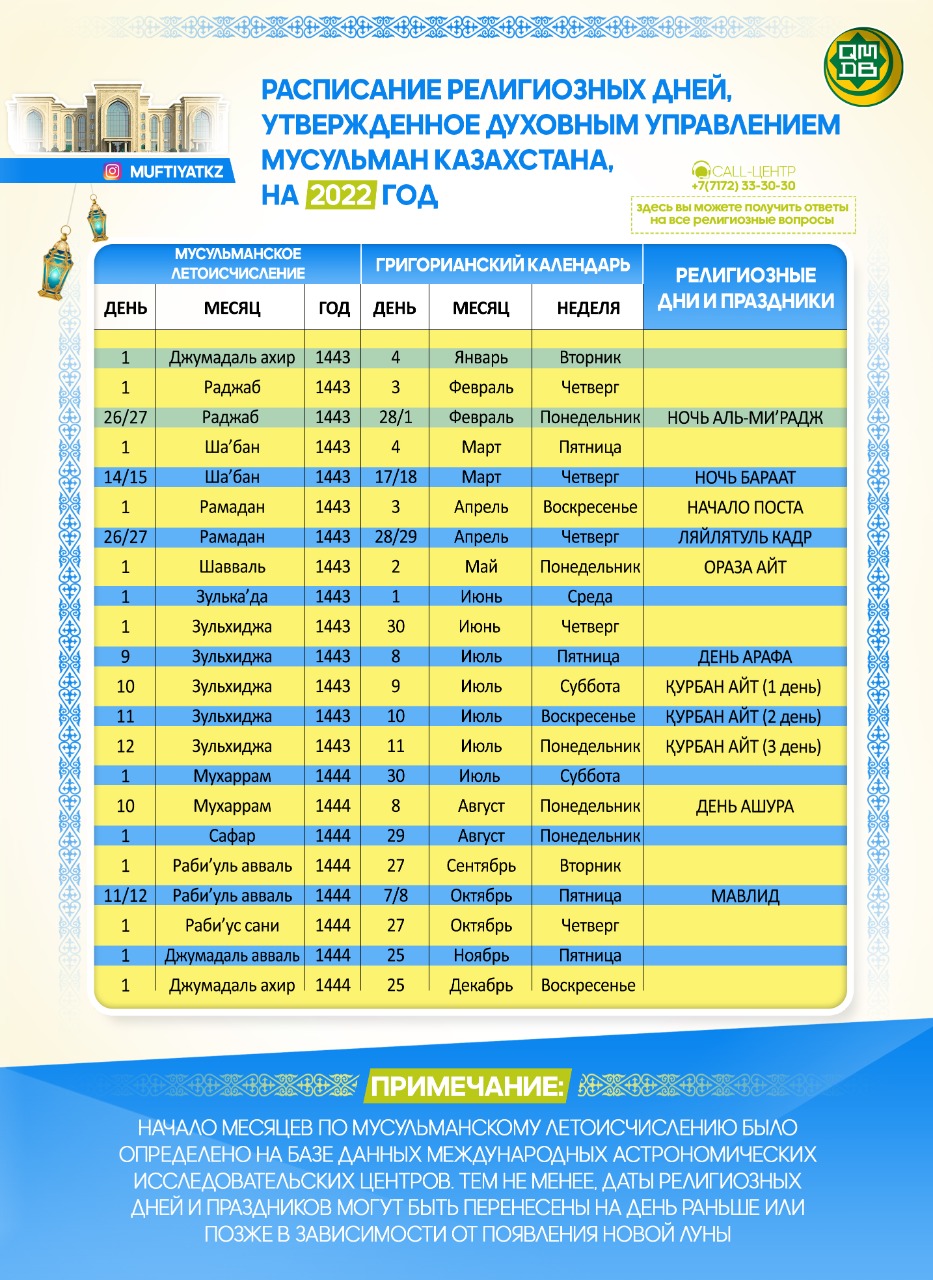 Отдел шариата и фетвы Духовного управления мусульман Казахстана утвердил расписание религиозных дней на 2022 год.