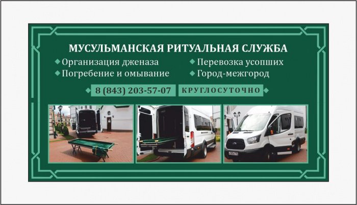 В компетенцию ритуальной службы ДУМ РТ также входят вопросы организации перевозок усопших на катафалке, копки могил, а также бесплатной помощи в получении свидетельства о смерти в органах ЗАГС. Таким образом, специалисты муфтията Татарстана помогут родственникам умерших на любых этапах организации захоронения и реализуют весь комплекс работ и обрядов погребения по канонам Ислама. Служба работает круглосуточно.