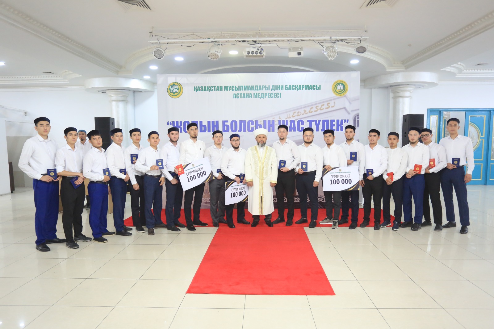 Мероприятие «Жолың болсын жас түлек!» началось с чтения аятов из Священного Кyр`ана, а Верховный муфтий помолился за благополучие всей страны. После этого на церемонии вручения дипломов выпускникам Председатель ДУМК Наурызбай кажы Таганулы дал напутствие и благословил студентов.