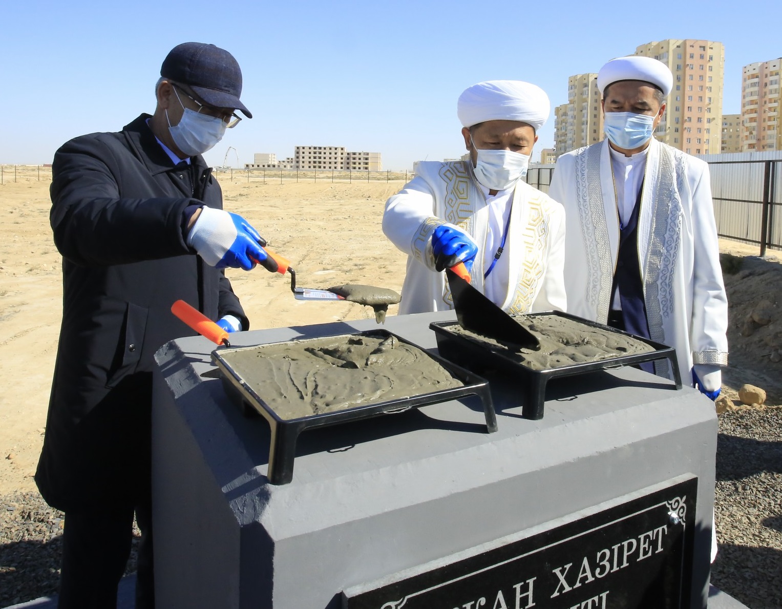 В ходе своего визита в Мангистаускую область Председатель ДУМК Наурызбай кажы Таганулы принял участие в церемонии закладки первого кирпича городской мечети Актау.