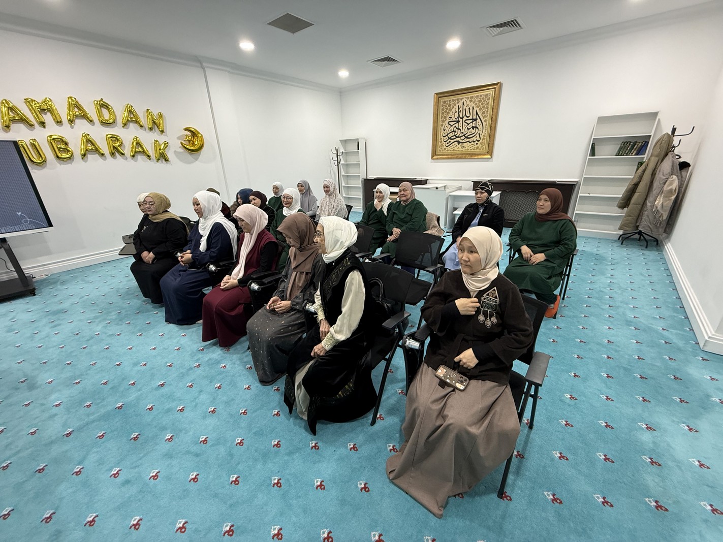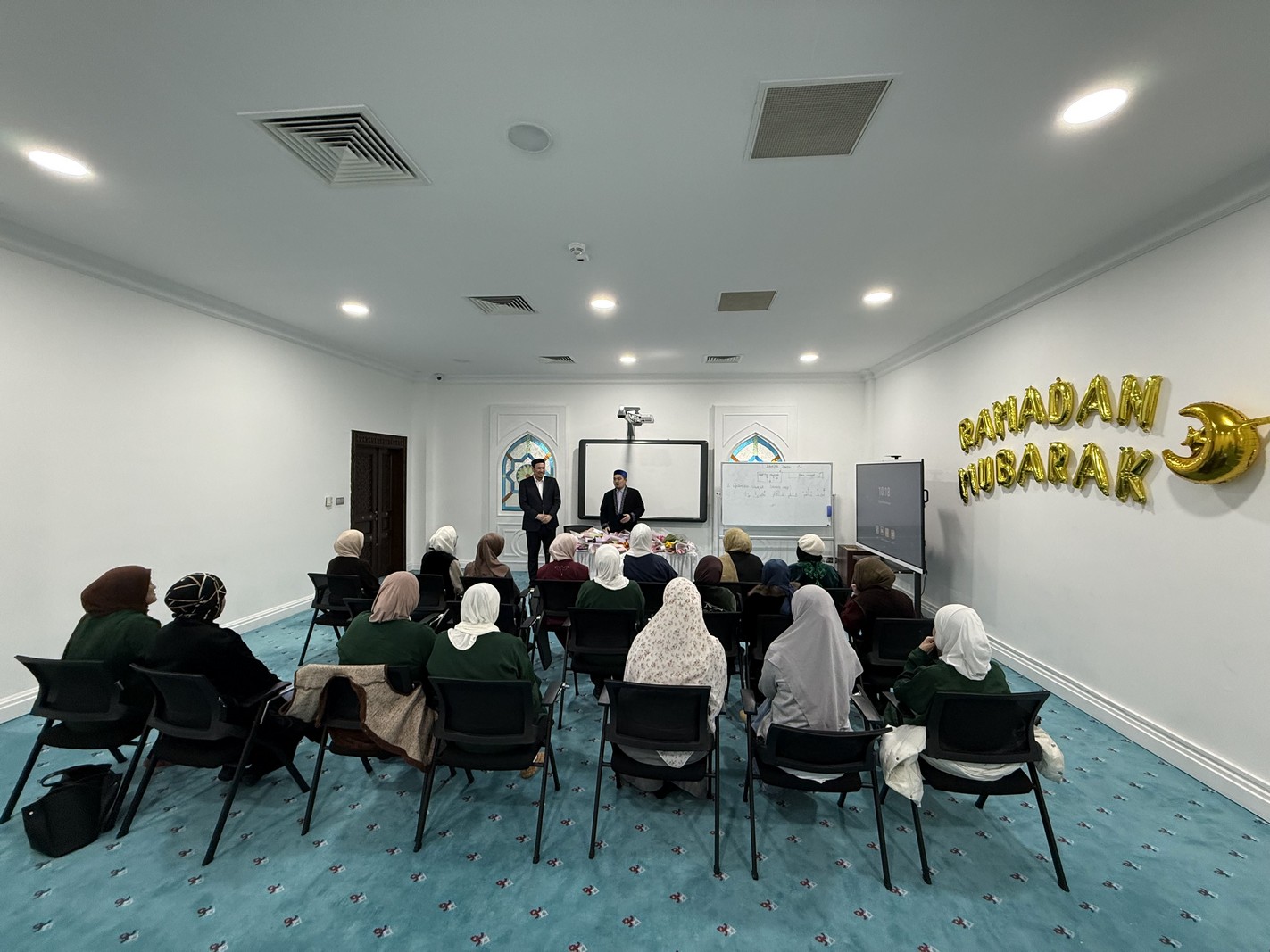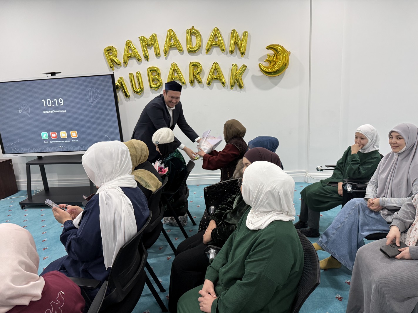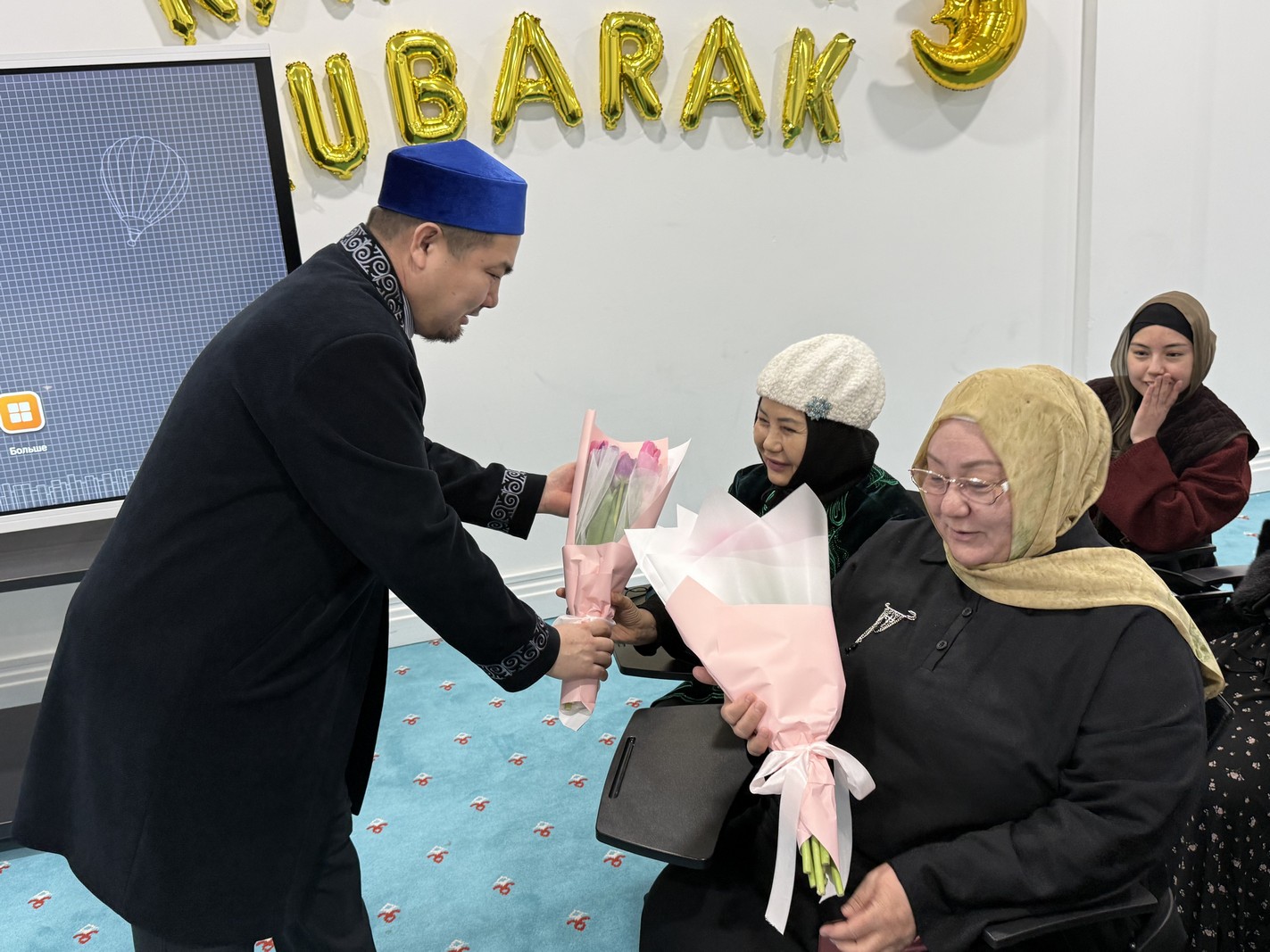 Мешіттің Бас имамы Ерболат Жүсіпов мешіт ұстаздары, қызметкерлерімен бірге мешітте қызмет атқарып жүрген әйел-қыздарға және ақ жаулықты аналарға ілтипат білдіріп, гүл шоқтарын табыстады.