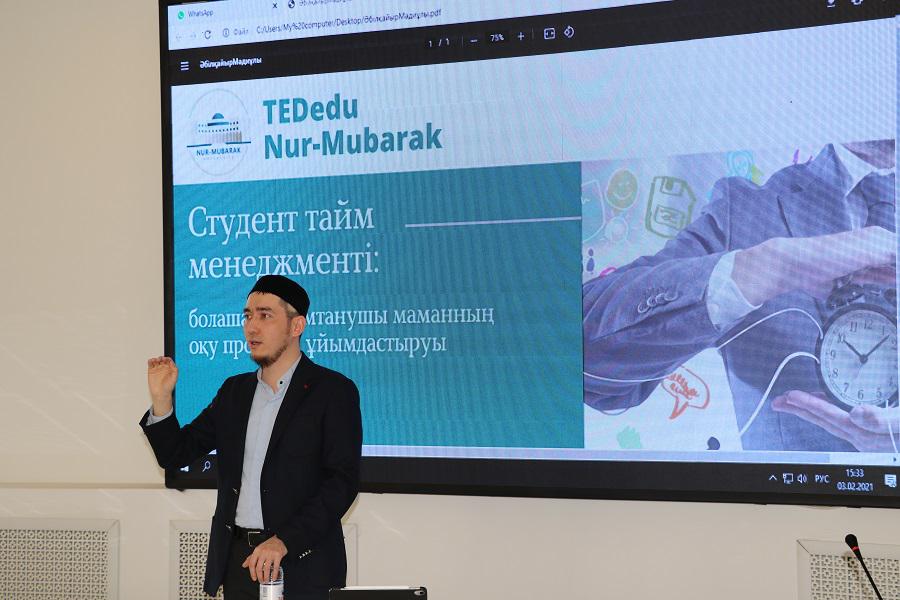 «Студенттің тайм-менеджменті: болашақ исламтанушы маманның оқу процесін ұйымдастыруы» уақытты үнемдеу жайлы тренингі жоспарлы мезеттен де асып жығылды. Себебі студенттер үшін тәжірибелі «бұрынғы» студенттің «аз уақытта» бірнеше тілді меңгерген бүгінгі PhD докторант әрі оқытушыға айналуының өзі көп мағлұмат бергендей, сауалдары туындап жатты. Исламтану кафедрасының оқытушысы, исламтанушы Әбілқайыр Мәдиұлы тайм-менеджмент дәрісінде ғұламалар өмірлерінен мысалдар келтіріп, бүгінгі «қаптап кеткен тренинтерде» айтыла бермейтін құнды мәліметтермен бөлісті. Әбілқайыр Жұматаев сонымен бірге жақсы әдет қалыптастырудың да жолдарын бірінші курс студенттеріне жайып салды.