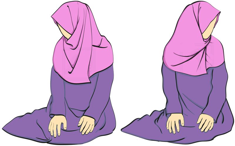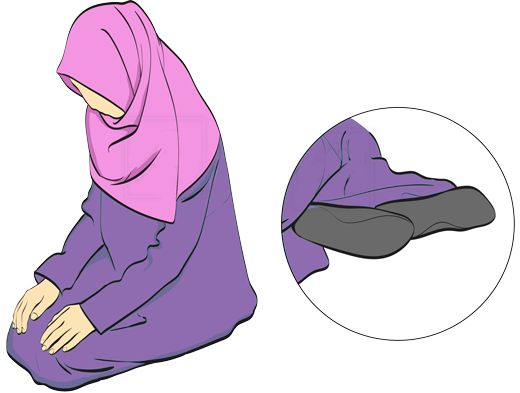 Содан соң (имам болса дауыстап) «Аллаһу Акбар» деп басын көтеріп, қыз бала болса, екі аяғын оң жаққа жіберіп, жартылай жамбастап жерге отырады