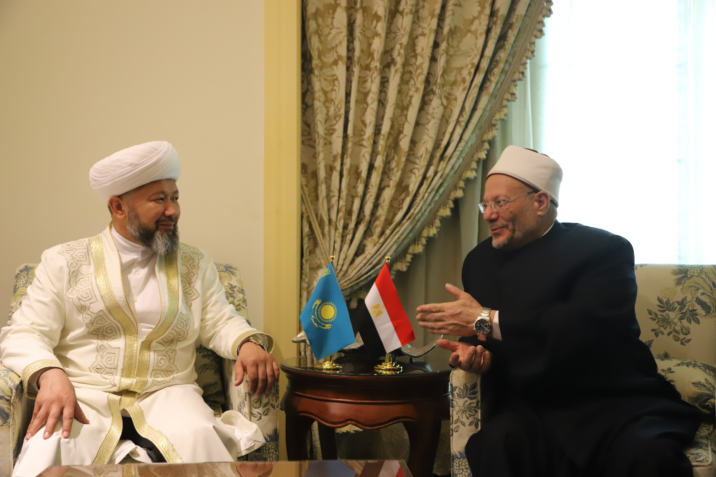 Өзіңізбен бір жыл бұрын кездескенімізде ортақ пәтуаларды бірге қабылдауға, қазіргі таңда мұсылман үмбетін алаңдатқан күрделі сауалдарды бірге шешуге уәделескен едік. Бұл бағытта жұмыстар жүріп жатыр. Қазақстан және Мысыр арасында екіжақты әріптестік һәм бауырластық байланыс қалыптасты деуге болады. Соның ішінде діни ынтымақтастық басты орында. Сізбен арадағы жасалған келісімге сай Мысыр тарапы елімізден келетін имамдар мен ұстаздарымызға пәтуа беру әдісін үйретуді қолға алды. Пандемияға байланысты бірнеше рет онлайн сабақтар өтті. Бұл ретте сіздің ерекше қолдауыңызға ризашылығымды жеткіземін», - деді Бас мүфти.