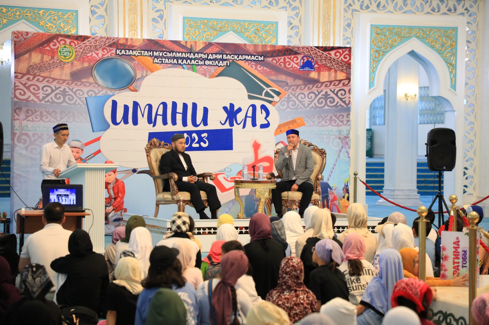 «Әзірет Сұлтан» мешітінде «Имани жаз-2023» жазғы сауат ашу курсының шәкірттеріне арналған «Қаримен сұхбат» атты рухани кездесу өтті. Құран аяттарымен басталған рухани кездесуде қонақ болған Республикалық Бас мешіттің наиб имамы, қари Серік Ахметов балаларды Құран үйренуге шақырып, өзінің қарилыққа жетудегі қиындықтарымен және Құран жаттау әдістерімен бөлісті. 600 шәкірт қатысқан игі кездесуде «Әзірет Сұлтан» мешітінің азаншысы Қайнар Базарханұлы да сөз сөйлеп, балаларға Құран оқудағы мақамдар жайында ақпарат беріп, Құранды әуезді оқуға шақырды. Кездесу соңында қари Серік Ахметов Құран аяттарын оқып, мешіттен білім алып жүрген балалардың келешегі үшін дұға етті.